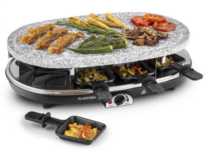 Rakletovací gril Klarstein All-U-Can-Grill sa môže pochváliť 3 vymeniteľnými grilovacími platňami – 1 z prírodného kameňa, 2 kovové platne. Súčasne sa na ňom dá pripravovať jedlo až pre 8 osôb. Lahodné pokrmy pripravíte rýchlo vďaka max. výkonu 1 500 W. Na grile sa dá pripravovať nielen mäso, zelenina a dary mora, ale aj sladké pokrmy ako palacinky a lievance. Teplota je bezstupňovo nastaviteľná otočným regulátorom, o prevádzke zariadenia informuje stavová LED-ka.